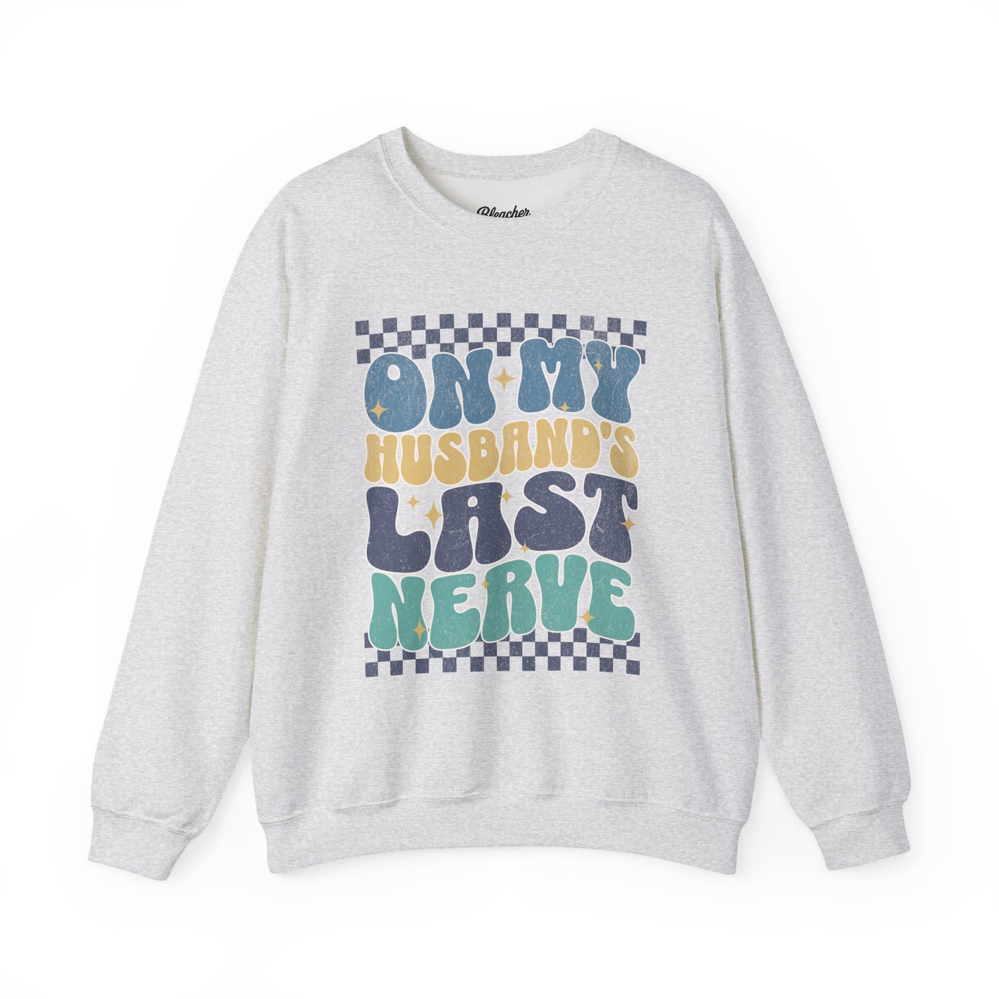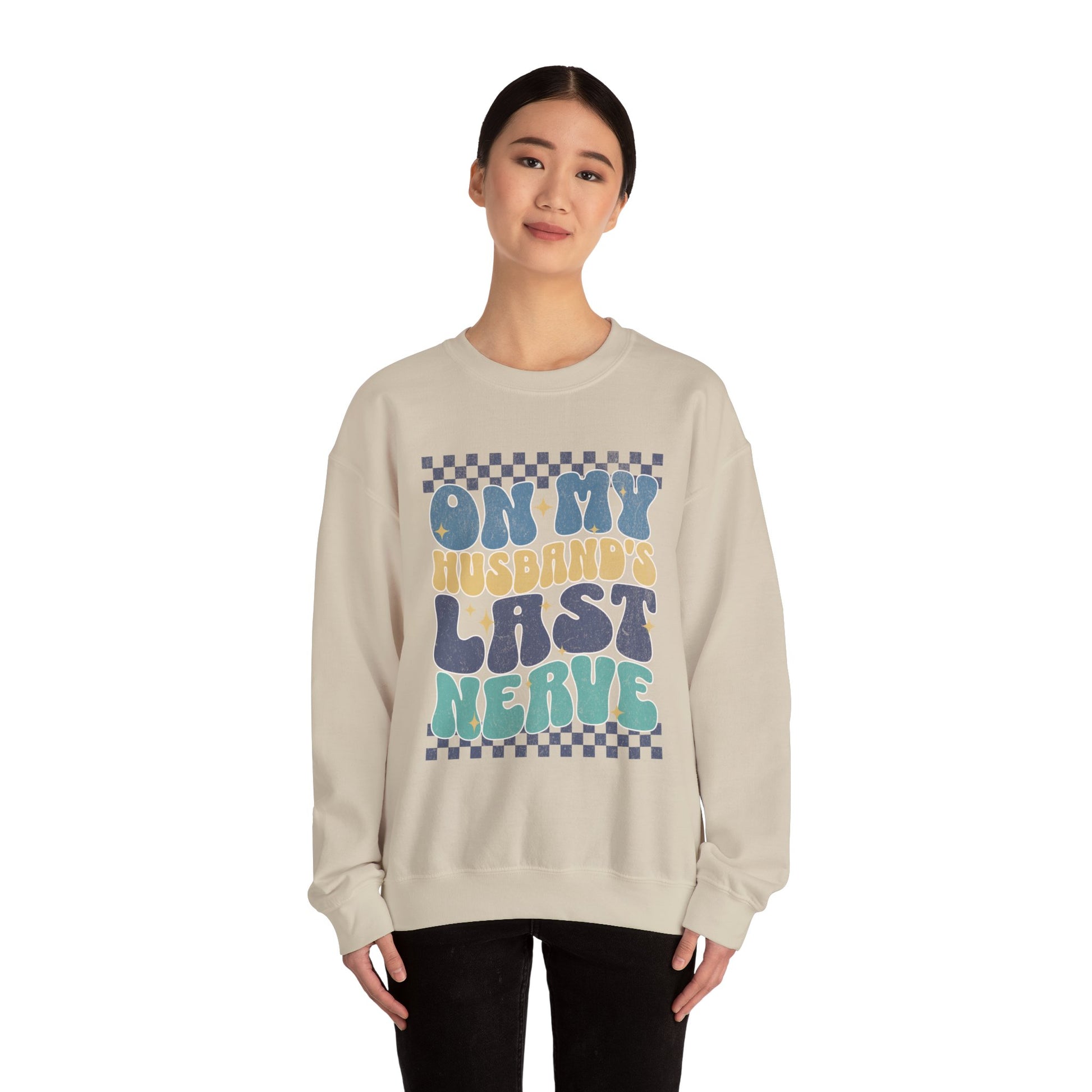 Embrace comfort and style with our cozy crewneck sweatshirt, perfect for those who appreciate a touch of humor in their wardrobe. With its playful design reading 'On My Husband's Last Nerve', this sweatshirt brings a lighthearted vibe to any outfit. Crafted for adults, this piece seamlessly fits into casual outings, cozy nights in, and family gatherings. Ideal for gifting during holidays like Valentine's Day or any special occasion, this sweatshirt is sure to bring smiles and laughter. Whether you're lounging at home or enjoying a night out, it's a versatile staple for anyone looking to add personality to their wardrobe.