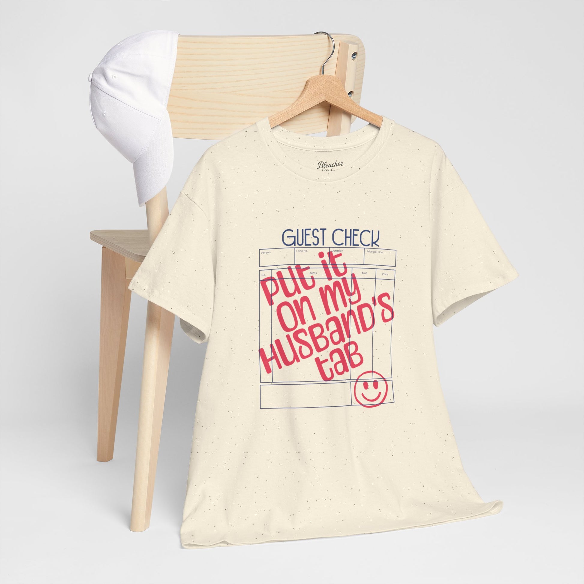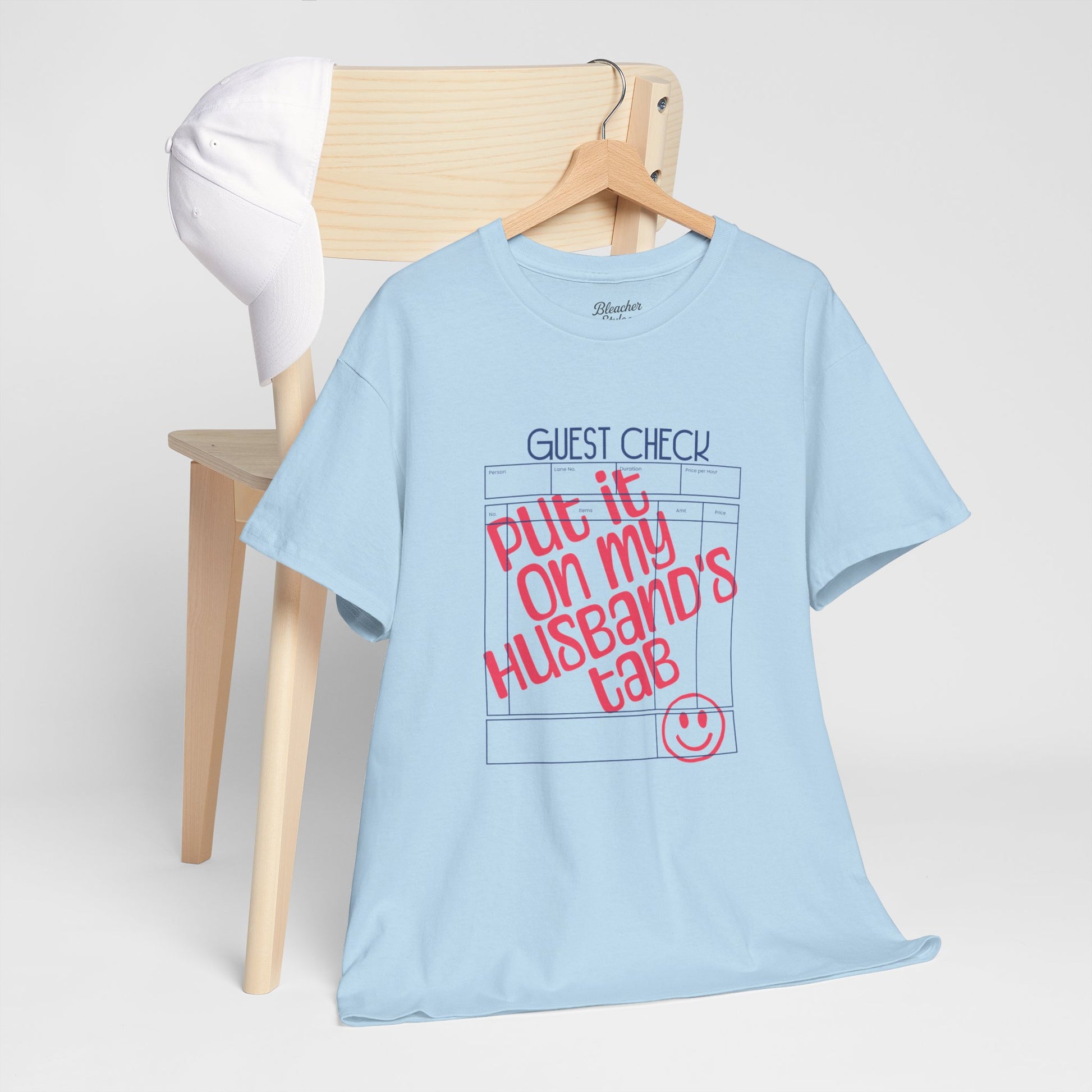 A relaxed, everyday tee that speaks with a wink. This classic crew shirt features a playful, hand-lettered guest check design reading “put it on my husband’s tab” with a stamped smiley — a lighthearted nod to diner days, late-night laughs, and inside-joke energy. Breathable midweight cotton, a neat ribbed collar, and a tear-away label keep the focus on comfort while the clean white canvas makes the pink-and-blue print pop. Wear it to coffee runs, casual date nights, or whenever you want to spark a grin and start a conversation.
